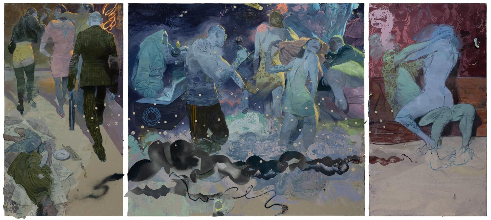This deliberate disorientation—placing viewers in perspectives that remain unresolved—echoes the fleeting moments of city life von Kaufmann captures. His often sombre worlds, populated by figures teetering between melancholy and agitation, spring from the present: one painting shows tattooed bodies in tribal-flower style, dancing. Repeating patterns on clothing, skin or wallpaper are applied with stencils, which at times also make their way onto the linoleum support itself. As the artist explains, this material allows »a more aggressive style of painting«.