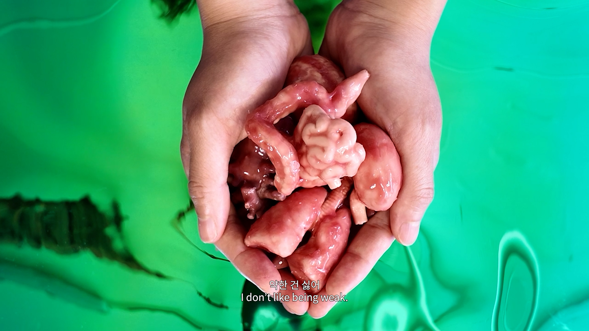 Many of her sculptural works are created from materials with bodily connotations such as wax or silicone, which Yoon transforms into poetic and fragile constellations. The resulting scenarios are often based on narratives around beliefs, behaviours, and verbal expressions that stem from a particular culture, mythology or religion. In the video works, the analysis of materials and form is combined with language and sound, questioning the relationship between body and environment, inner and outer reality.